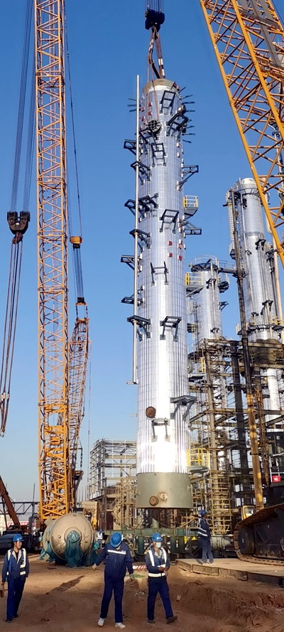 據(jù)悉,該塔是甲醇聯(lián)合裝置最高、最重的設(shè)備,塔分三段到場(chǎng),本次吊裝的為該塔下段,由850噸履帶吊主吊,450噸履帶吊溜尾,接下來將完成下段環(huán)縫的組對(duì)焊接,為中、上段安裝創(chuàng)造條件。