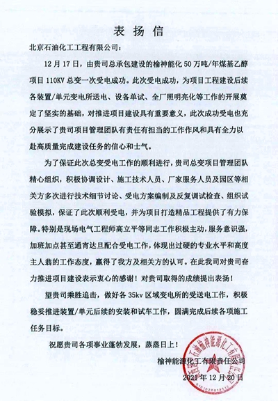 【表揚(yáng)信】祝賀榆神能化煤基乙醇項(xiàng)目110KV總變一次受電成功