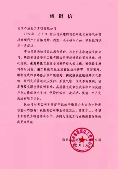 項(xiàng)目建設(shè)期間,面對(duì)工期緊張、場(chǎng)地狹窄、設(shè)備吊裝困難等諸多不利因素,項(xiàng)目組全體人員,精心策劃,合理安排施工計(jì)劃,緊盯節(jié)點(diǎn)目標(biāo),有效推進(jìn)了項(xiàng)目建設(shè)進(jìn)度,提前一個(gè)月完成所有項(xiàng)目計(jì)劃。為此,陜西未來(lái)能源化工有限公司發(fā)來(lái)感謝信,對(duì)我公司在項(xiàng)目建設(shè)中付出的努力表示感謝,對(duì)項(xiàng)目試車成功表示祝賀!