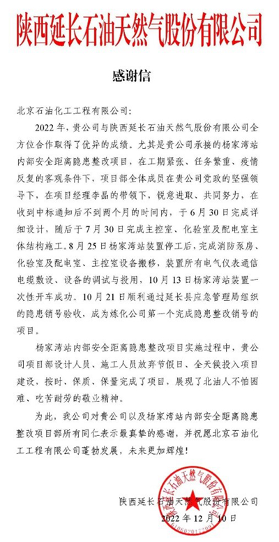 近日,北京石油化工工程有限公司收到來自陜西延長石油天然氣股份有限公司的感謝信,對我公司總承包的楊家灣站內(nèi)部安全距離隱患整改項目在建設(shè)期間精心策劃、合理安排施工、克服不利因素,保質(zhì)保量按期完成了任務目標,得到了業(yè)主的肯定。