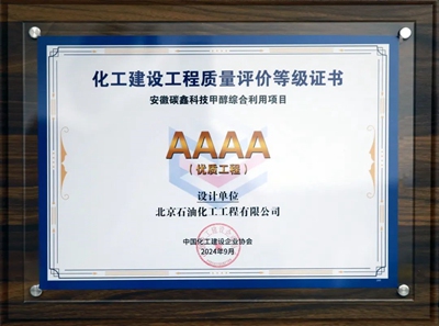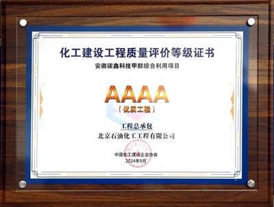 近日,由北京石油化工工程有限公司(簡稱:北油工程)總承包的安徽碳鑫科技甲醇綜合利用項(xiàng)目乙醇聯(lián)合裝置,獲得2024年度,中國化工建設(shè)企業(yè)協(xié)會組織評選的化工建設(shè)工程質(zhì)量總承包優(yōu)質(zhì)工程和設(shè)計(jì)單位優(yōu)質(zhì)工程。