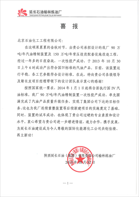 由我公司承擔(dān)設(shè)計(jì)的榆林煉油廠90萬噸/年汽油精制裝置,經(jīng)過一年多設(shè)計(jì)和施工單位的日夜奮戰(zhàn),已于2013年10月30日成功生產(chǎn)出符合國IV標(biāo)準(zhǔn)的汽油,目前該裝置運(yùn)行平穩(wěn),各工藝參數(shù)達(dá)到設(shè)計(jì)指標(biāo)。為此,業(yè)主單位延長石油榆林煉油廠特向我公司發(fā)來喜報(bào)。